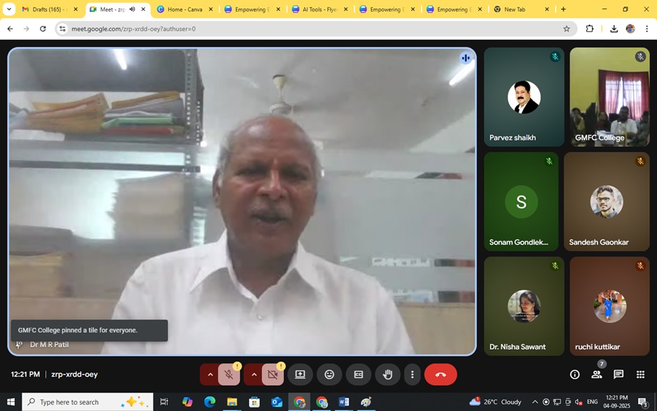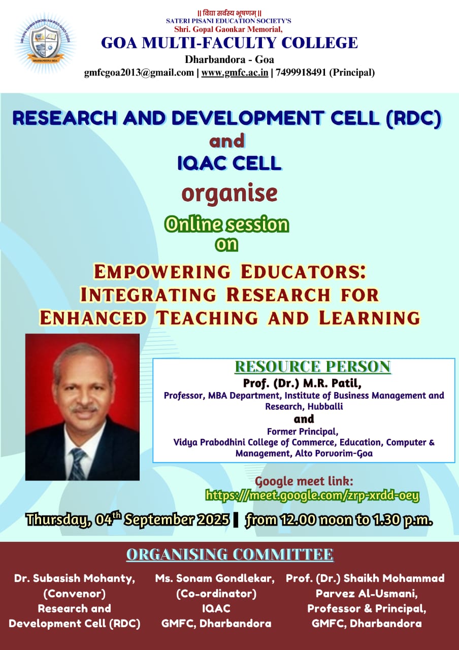 Research & Development Cell and IQAC of Goa Multi-Faculty College organzied a session on 4th September 2025 for Teaching Staff on the topic “Empowering Educators: Integrating Research for Enhanced Teaching and Learning” with Prof. M.R. Patil as the resoruce person.