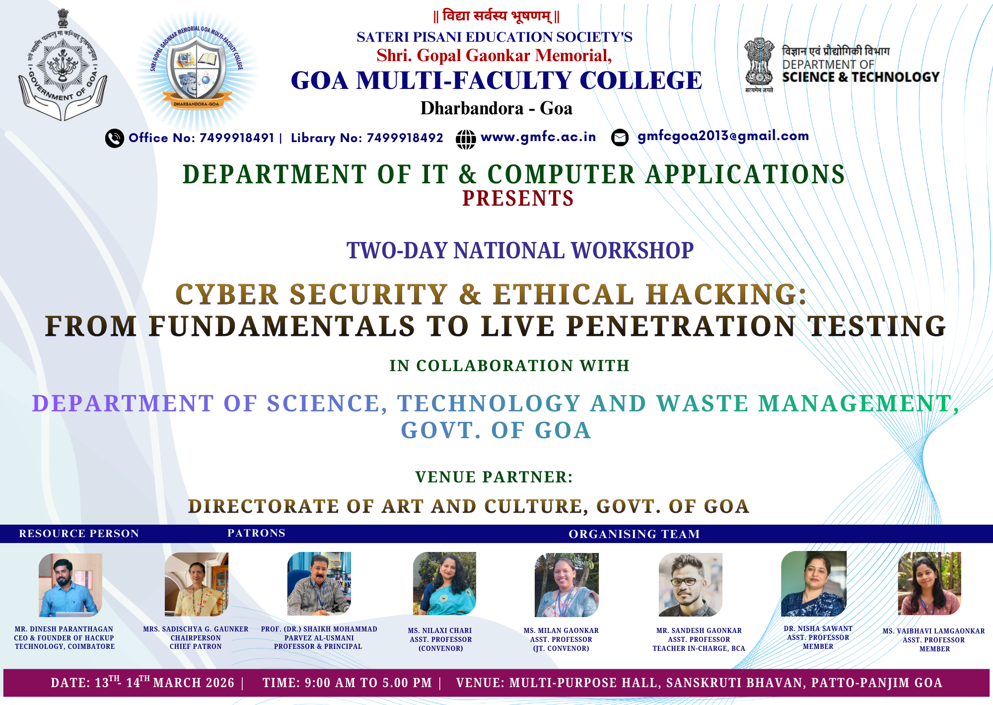 The Department of IT & Computer Applications of SPES’s Goa Multi-Faculty College, Dharbandora–Goa, in collaboration with the Department of Science, Technology and Waste Management, Government of Goa, is pleased to organise a Two-Day National Level Workshop titled: